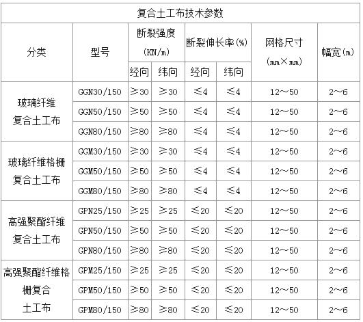 由120G的土工布和50Kn的玻璃纖維土工格柵或滌綸土工格柵復(fù)合。另:土工布和土工格柵的具體型號(hào)可以視要求定做。土工格柵的寬度為1m-6m。